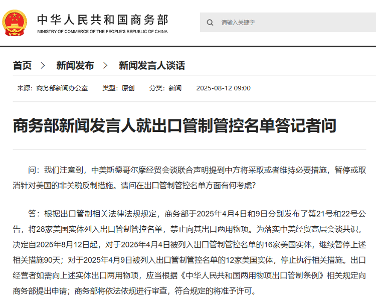 商务部发言人回答了记者关于出口控制列表的问题。问:我注意到中国提到中国所说的,它采取或维护了暂停或取消对美国的非税务措施的必要措施。出口控制列表的考虑因素是什么?答:根据有关出口控制的相关法律法规,商务部分别于2025年4月4日和9日发布了广告。这包括出口控制列表中的28个美国实体,这些实体禁止出口双重目的文章。为了就中国与美国之间的高级经济咨询达成共识,已决定,从2025年8月12日,从2025年8月12日开始将上述措施继续暂停90天,以涉及2025年4月4日的美国实体列表中的16个美国实体。措施将被暂停。如果出口运营商必须将双重目的文章出口到先前的实体,则将根据“关于中国共和国双重目的对象的出口法规”的相关规定的相关规定将其应用于商务部。商务部根据法律和法规进行审查,如果满足要求,将获得许可。网站屏幕截图