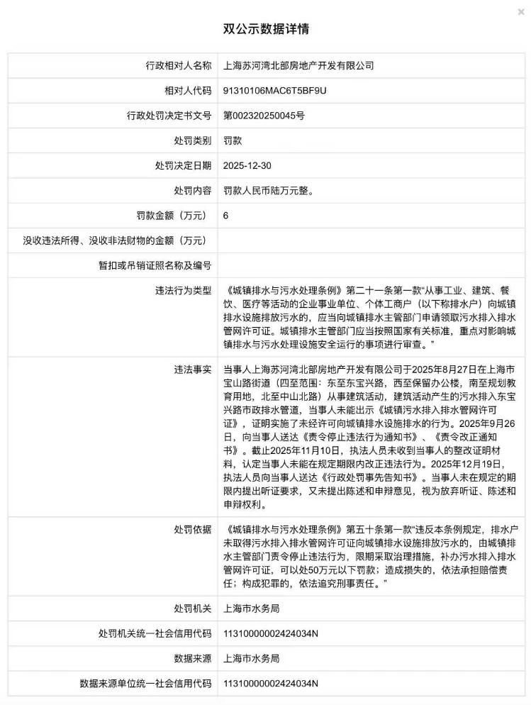 海报新闻记者近日报道,上海市水务局已发布行政处罚信息。上海苏河湾北房地产开发有限公司因在施工活动中擅自向城市排水设施排放污水,被罚款6万元。经查,利害关系人上海苏河湾北房地产开发有限公司正在上海市宝山路街道(具体区域:东侧宝兴东路、西侧预留办公楼、南侧规划教育用地、北侧中山北路)进行建设活动,并将施工产生的废水排入市东宝兴路排水管道。该党并未出示“城镇污水排入排水管网许可证”。该行为违反了《城镇污水处理条例》第二十一条第一款的规定因。针对上述违法行为,执法人员于2025年9月26日向当事人送达了《责令停止违法行为通知书》和《责令改正通知书》,但截至2025年11月10日,认定当事人未按要求提交改正证明,且未在规定期限内改正违法行为。 2025年12月19日,执法人员向当事人送达了《行政处罚预先告知书》。当事人在规定期限内不请求听证或者不提出陈述或者申辩的,视为放弃听证、陈述或者申辩的权利。上海市水务局依据《城镇污水处理条例》第五十条第一款的规定,对上海苏河北房地产开发有限公司处以6万元罚款。据天眼查信息显示,上海苏河湾北房地产开发有限公司成立成立于2023年2月9日,为国有独资企业,注册资本2亿元,法定代表人为陈吉先生。最初,该公司由上海苏河湾(集团)有限公司100%持股,但2025年6月保利地产集团有限公司通过上海联合证券交易所以约8.5亿元成功竞购公司51%股份,成为第一大股东。目前,公司的最终实益管理人为保利(香港)房地产开发有限公司。