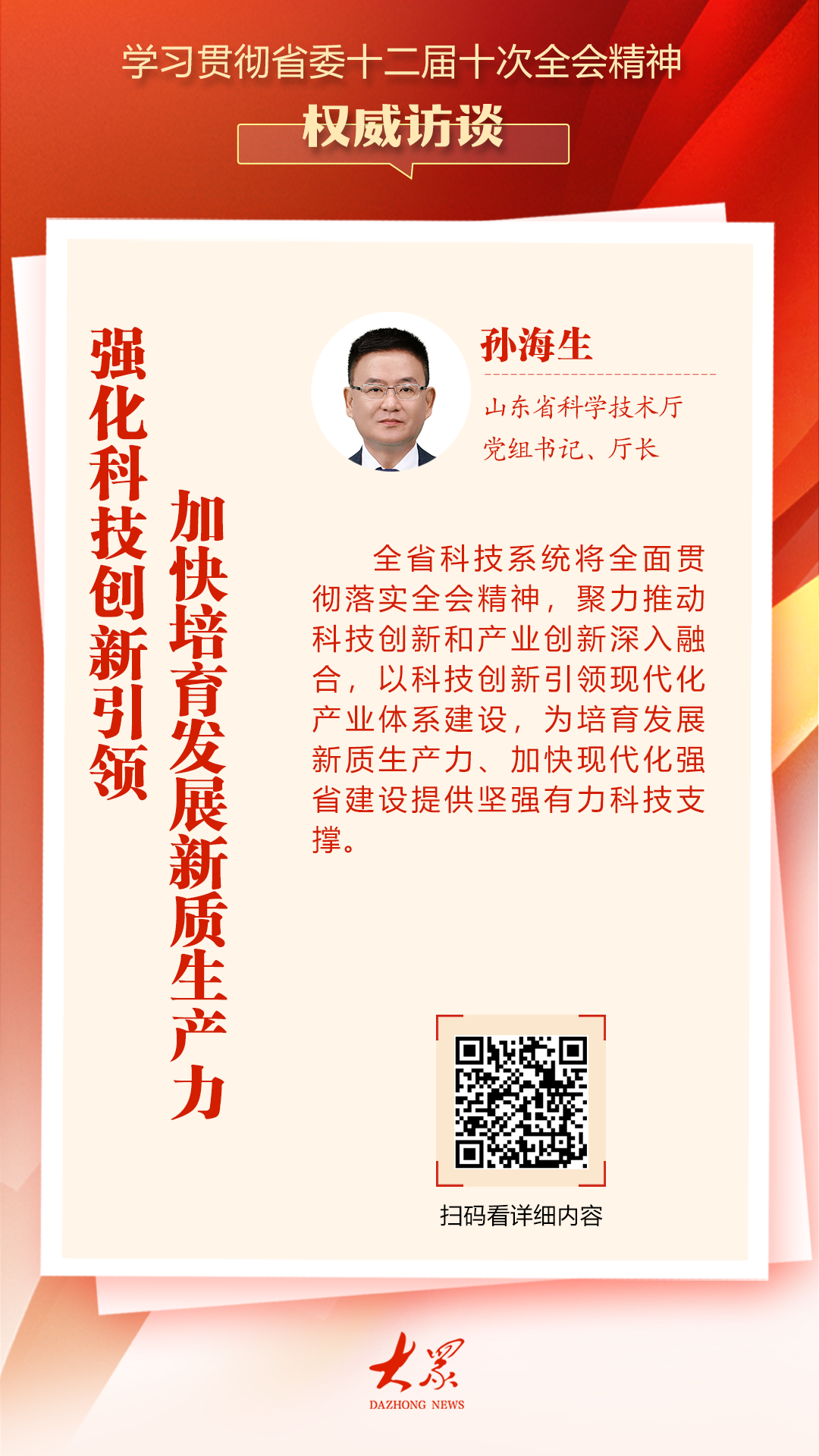 省委十二届十次全会专门制定《加快建设高水平创新全省引领新生产力发展》专章,充分体现了省委、省政府对科技创新的重视,强调科技创新引领新生产力发展的核心作用。各省科技系统将全面贯彻会议精神,齐心协力推动科技创新与产业创新深度融合,以科技创新引领现代产业体系建设,为加快培育发展新生产力、建设全省现代化强市提供坚强科技支撑。首先,要着力构建强大的科技能力战略体系,全面增强科技创新综合能力。全力打造国家区域科技创新中心和产业科技创新高地,支持崂山研究院等重大创新平台开展系统科学研究,全面实施基础研究十年行动,加快产出一批原创性、颠覆性科技成果。围绕工业主板、高端芯片等关键领域精准组织开展重大科技攻关,攻克多项关键共性技术和先进工艺装备,为我国关键产业链供应链安全可控作出贡献。二是深入推进科技创新与产业创新融合,助力构建现代产业体系。加快实施重点行业科技创新行动计划,建立“企业求技术、市场求成果”双向信息传播和领导机制,全面推进重大技术突破和成果转化。通过产学研结合加强企业主导创新,支持企业组建创新联盟,牵头重大科技项目,打造高能创新平台。完善科技成果转化服务体系,强化“山东省科技市场”供需耦合能力,加快概念验证和试点验证平台设计建设,推动更高质量转化科学技术成果转化为现实生产力。三是深化科技体制机制改革,加快构建一流科技创新生态系统。全面增强科技创新对教育和人力资源的带动作用,推进科技教育和人力资源一体化改革。深化人力资源评价和激励改革,建立注重创新能力、质量、效益、贡献的人力资源评价体系,为科研人员专注研究创造最佳条件。推动学校、高校、企业高层次人才“互招互访”,畅通人才交流渠道,最大限度激发创新创造活力。 (人气记者王延安、张锡坤、王亚吉编辑e)