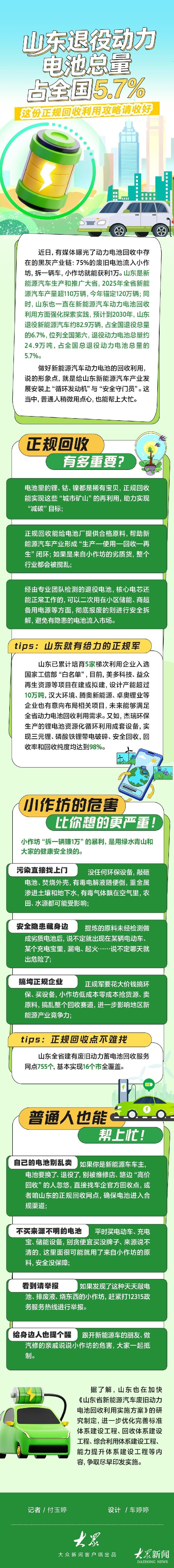 近日,有媒体曝光了电池回收领域存在的黑灰色产业链。 75%的废旧电池最终进入小作坊。拆解一辆汽车,一个小厂就能盈利1万元。山东省是新能源汽车生产和推广的重点省份。 2025年,全省新能源汽车产量将突破110万辆,今年的目标是120万辆。与此同时,山东省也在加强新能源汽车动力电池回收利用的探索和实施。到2030年,山东省预计报废新能源汽车约82.9万辆,占全国总量的6.7%,居全国第六位。电池使用总量约为24.9万吨,占日本电池使用总量的5.7%。成功回收新能源汽车电池模拟ply,意味着为山东新能源汽车产业发展装上“循环发动机”、“安全卫士”。公众的一点善意可以起到很大的作用。 (大众新闻记者胡玉婷,设计:车婷婷)