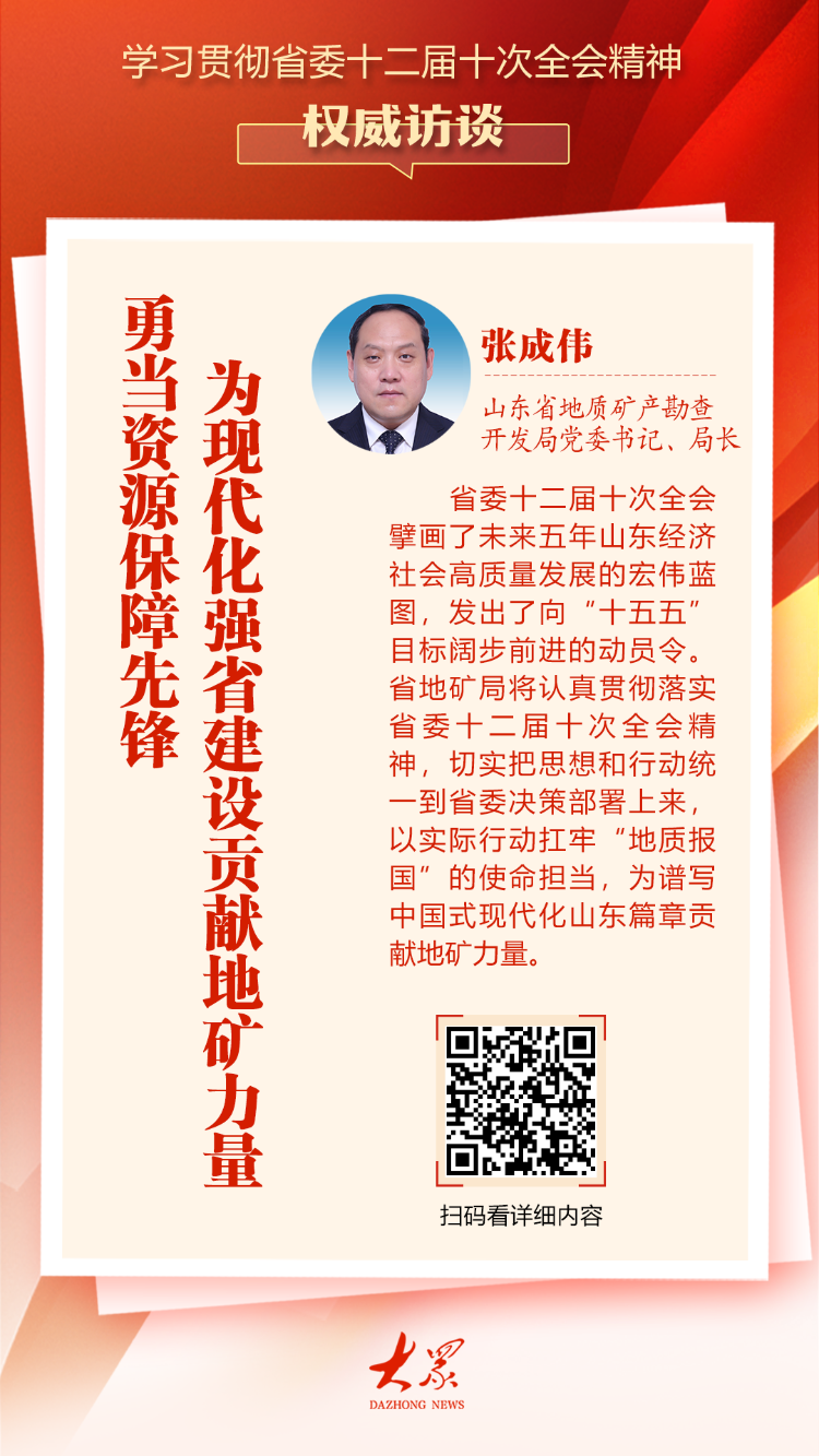 党的十二届十次全会发出动员令,制定未来五年山东省经济社会高质量发展宏伟规划,朝着“十五五”规划目标奋进。省地矿厅将认真贯彻落实党委十二届十次全会精神,切实把思想和行动融入省委决策和发展,以实际行动坚定肩负“国家地质服务”使命,为谱写山东省地矿资源中国式现代化篇章贡献力量。我们将以保障能源资源安全为重点,推进新的战略行动,推动矿业勘探取得新进展。密切关注“萨尔托德尔N项目”“工业能源水平”全会发展,聚焦战略重点围绕全省资源需求,优化勘查设计,加强重点攻关,及时开展勘查活动,推动金矿、富铁矿等重点矿种增储上产,为构建现代产业体系奠定坚实的资源基础。积极融入美丽山东建设,拓展生态地质服务新领域。满足全国16个城市的重点地质需求,基于名录提供系统化、定制化的地质服务。加强清洁地热能勘探开发,支撑向绿色能源转型 立足地质矿产专业优势,在黄河流域生态保护、地质灾害防治、农业地质、城市地质等领域持续发力,为社会提供精准地质服务建设优质低碳绿色发展试验区。我们将继续深化改革创新,培育发展地质矿产新生产力。坚持成果转化方向,推动技术创新与产业创新深度融合,打造具有地质特色的产业和具有根本竞争优势的品牌矩阵。依托国家重点研发项目和部委科研平台,攻克深度勘探、智能勘探等关键技术,打造山东强大的地矿人工智能创新中心,加快地质工作数字化转型,提质增效,引领地矿行业高质量发展。 (视频由大众记者方磊、杨成、张焕辰编辑)